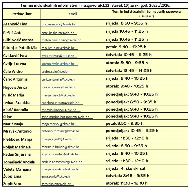Termini individualnih razgovora s predmetnim nastavnicima/ama 2025./2026.